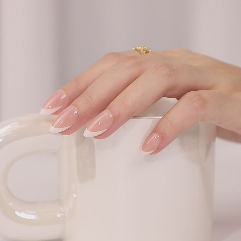 Élégance est un press-on à la forme amande avec une French manucure nette et lumineuse. Sa ligne raffinée allonge visuellement les doigts et offre un rendu naturel, élégant, effet salon dès la pose.