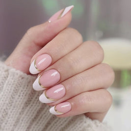 Liseré d’Or revisite la French almond avec une bordure dorée fine et lumineuse. La forme amande élance la main, le tracé précis apporte un rendu chic, moderne et raffiné — parfait du quotidien aux soirées. Des faux ongles à coller au look French doré élégant, pour un effet salon immédiat signé ONAILZ.