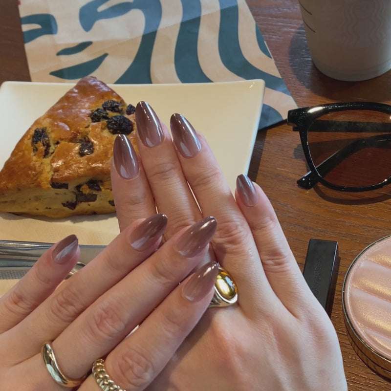 Café Miroir décline un ombré coffee au finish glazed chromé sur forme amande : surface ultra-lisse, reflets miroir subtils et dégradé chaud pour un rendu chic, moderne et lumineux du quotidien aux soirées. Un nude café sophistiqué pour des faux ongles press-on au look glossy — signature ONAILZ.