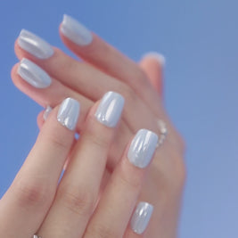🌊 Bleu Azur décline un bleu clair lumineux en forme carrée avec un effet chromé émaillé : surface ultra-lisse, éclat miroir maîtrisé et rendu frais, chic et moderne toute l’année. Un bleu propre et poli pour des faux ongles press-on au look lumineux — la signature ONAILZ.