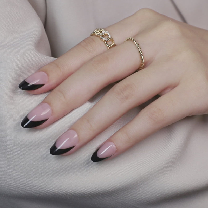 🖤 Noir Couture réinterprète la French manucure avec des tips noirs au laqué profond sur une forme amande qui allonge la main. Contraste nude/noir impeccablement tracé, rendu chic, moderne et assumé — parfait du quotidien aux soirées. Un look effet salon immédiat pour celles qui veulent une French noire iconique, signé ONAILZ.